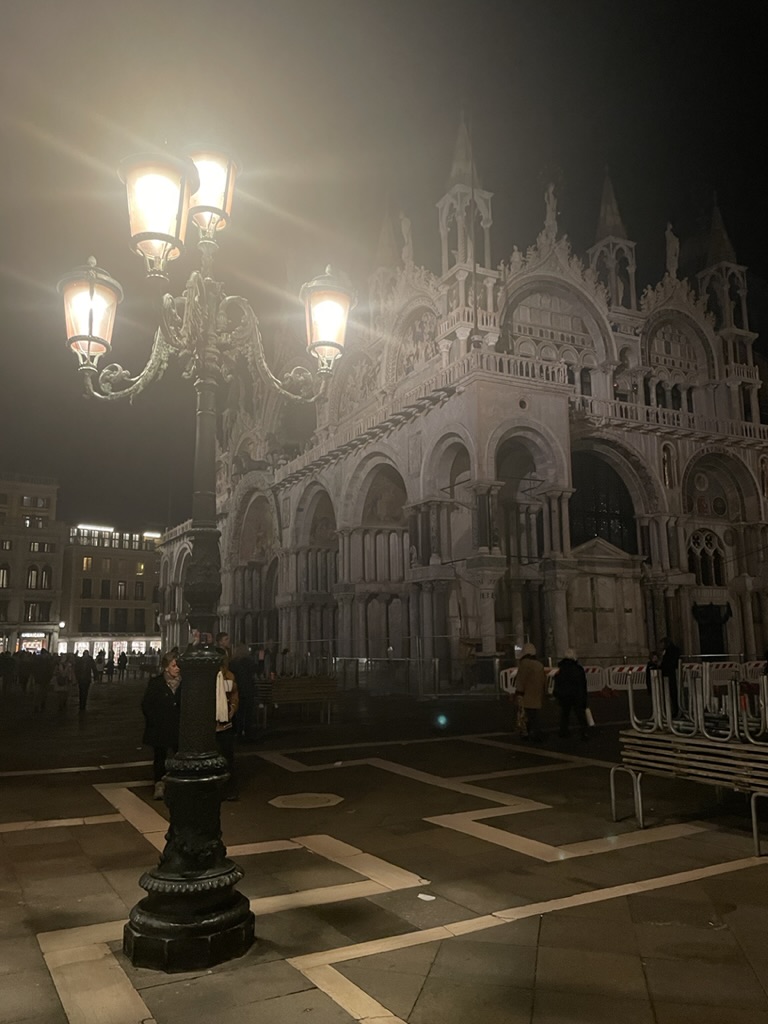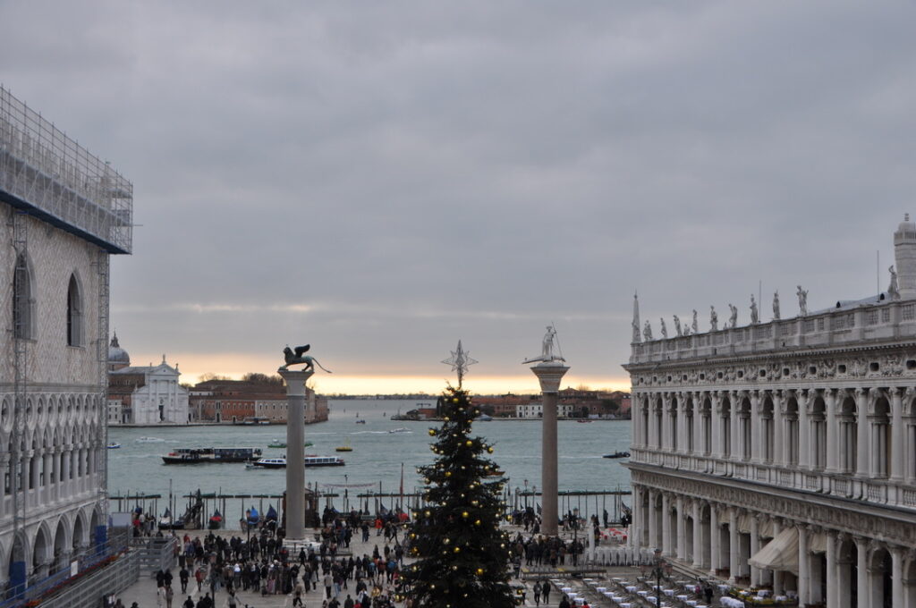 このサンマルコ広場、ヴェネツィアの中でも低地で海に面しており、定期的にヴェネツィアを見舞う「アルア・アルタ」と呼ばれる洪水で、真っ先に水没する場所としても知られています。訪れた時期がちょうどクリスマスの時期だったので、広場には大きなツリーが飾ってありました。