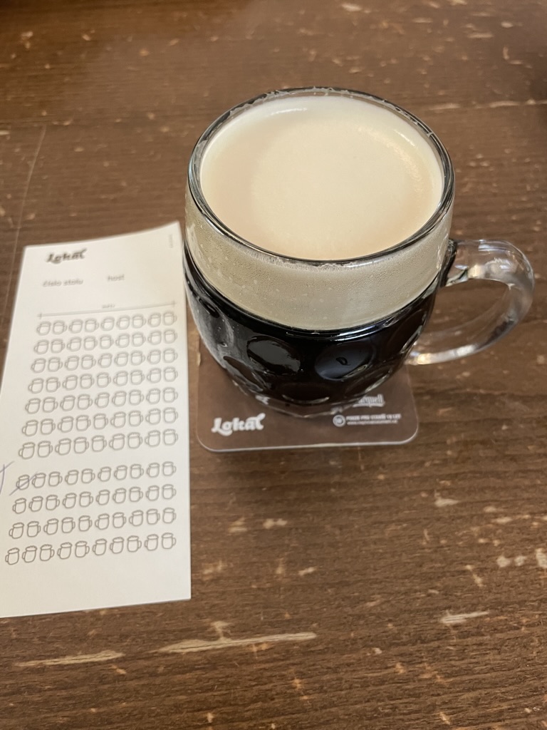 席に着くとまずビールをどうするか尋ねられます。今回は黒ビールのKozelを注文 52CZKでした。